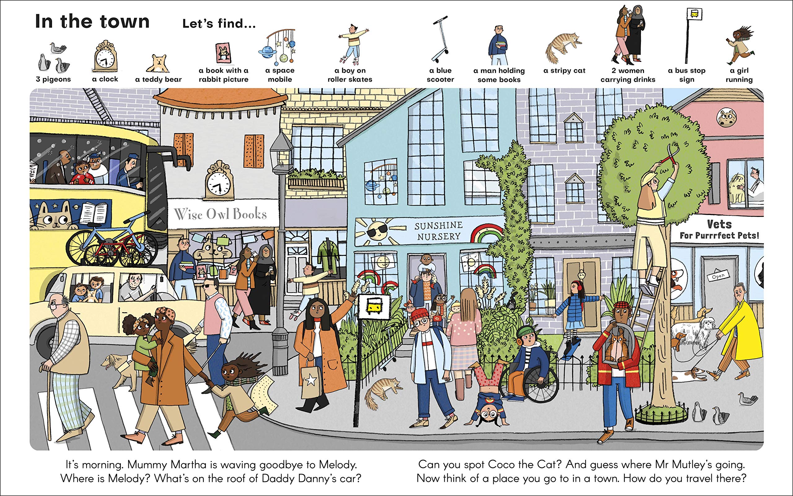 This wonderfully interactive book draws children into the scenes on the page and encourages them to become a part of the action. Each page depicts a different location such as a sunny beach, a colourful toy shop, or a beautiful park - and interesting characters throughout!