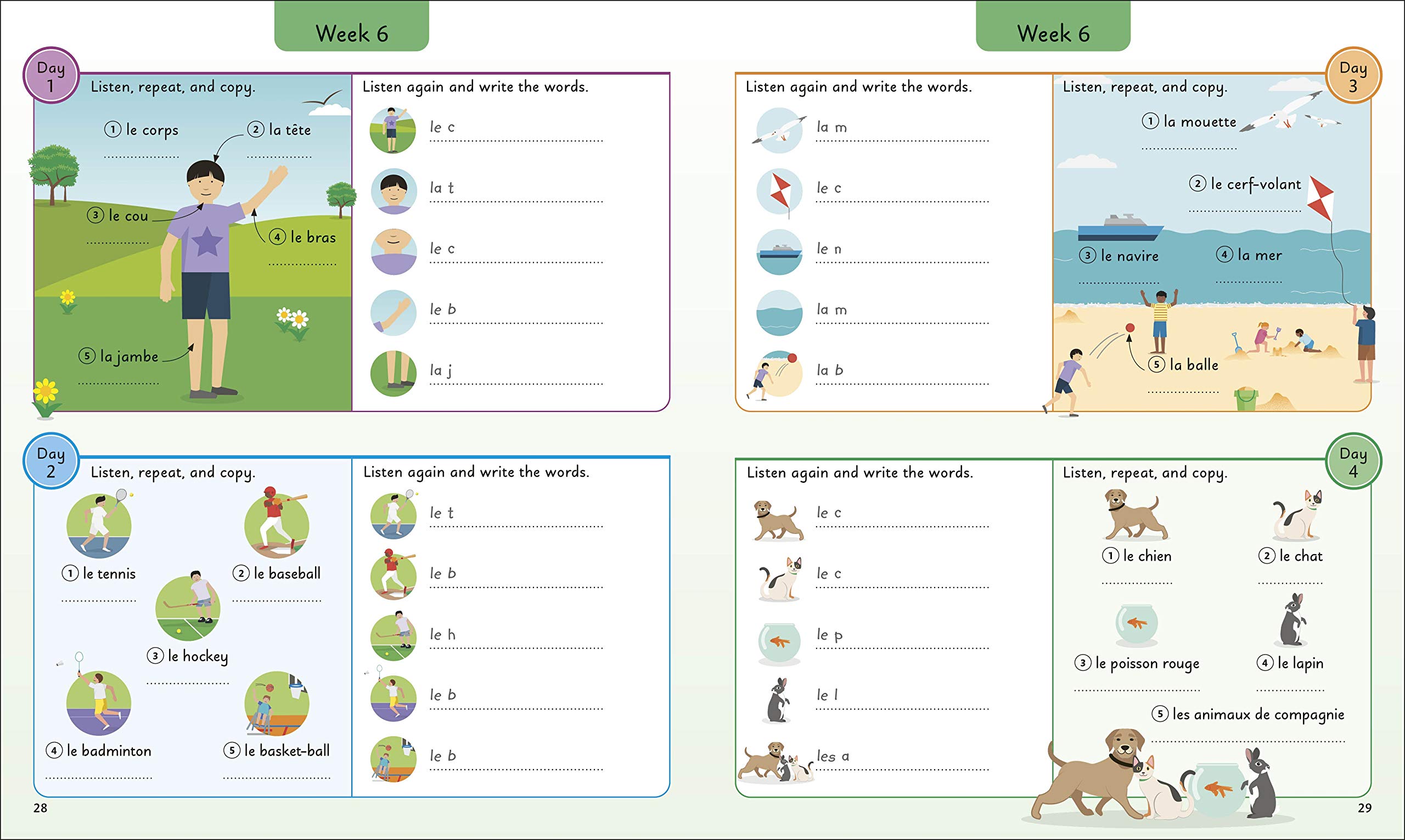 - Beautifully illustrated scenes that teach and test five words at a time. New vocabulary is practised again at the end of each week in two pages of exercises