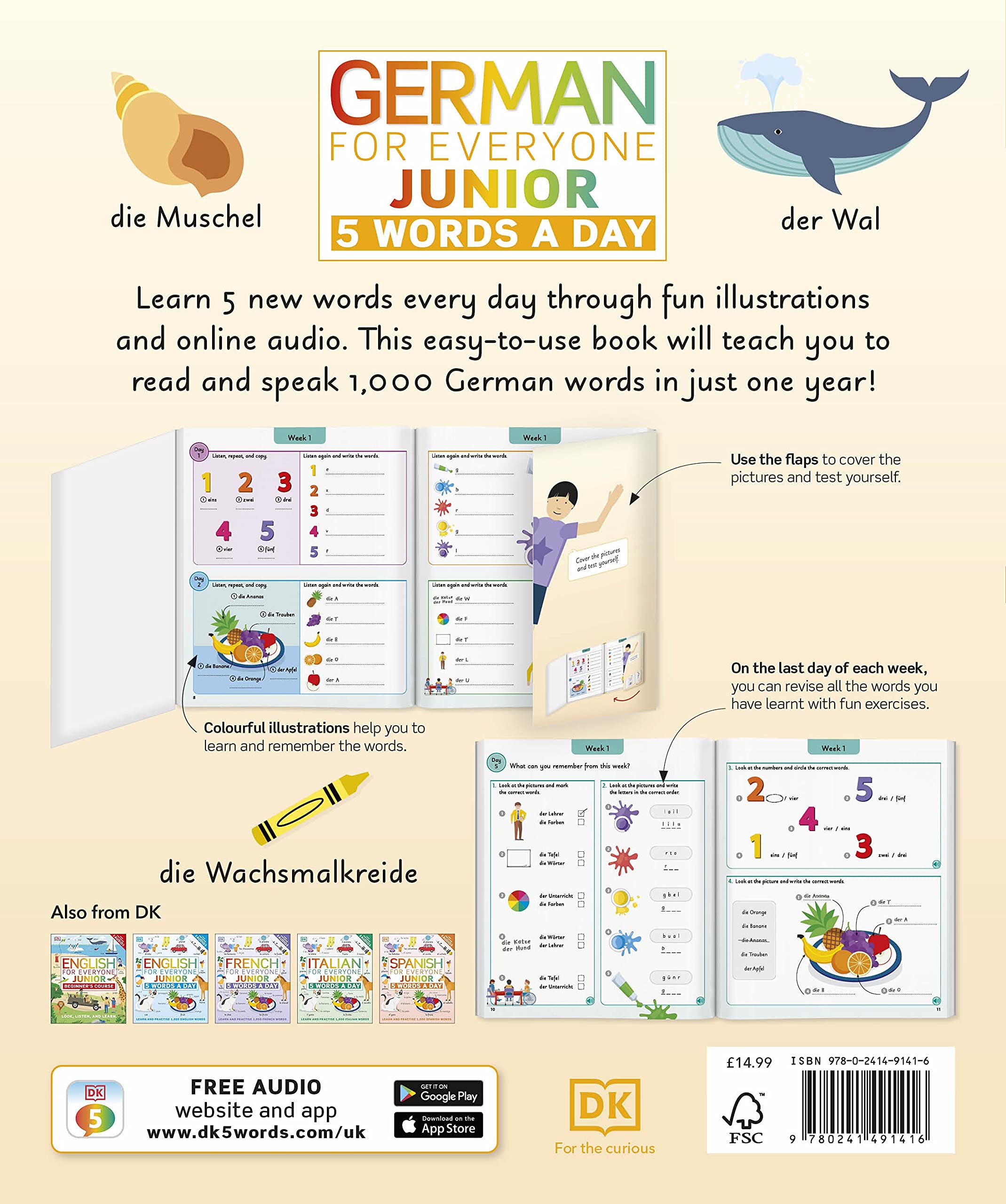 From animals and sports to colours and plants, German for Everyone Junior teaches a mix of nouns and verbs through stunning illustrations with each new word clearly labelled. This encourages young learners to memorise the words before covering them with the cleverly designed flaps and testing their new knowledge. Accompanying audio means that children can also practice their German pronunciation as many times as they want.