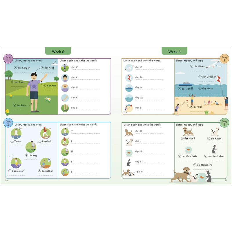 - Beautifully illustrated scenes that teach and test five words at a time. New vocabulary is practised again at the end of each week in two pages of exercises